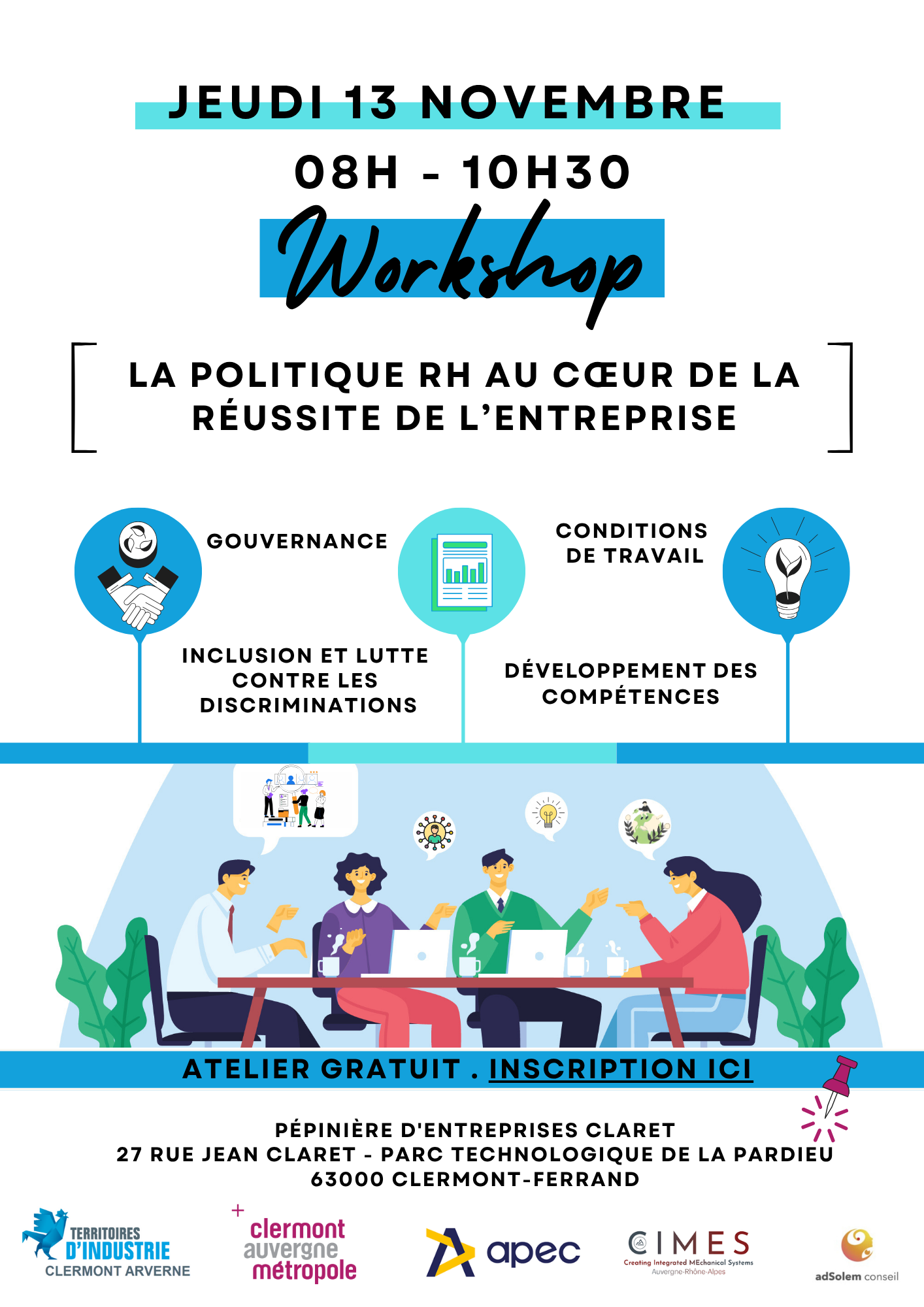 Clermont Auvergne Métropole et le Territoire d'Industrie Clermont Arverne, en partenariat avec l'APEC, CIMES et AD SOLEM organisent leur premier workshop sur la politique RH au cœur de la réussite de l'entreprise.